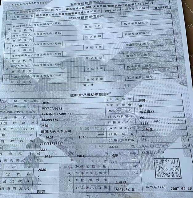 鄂H A6199輝騰WVWFD73D778小型轎車,注冊日期2007年9月,年檢到2021年9月,參考價5萬元。